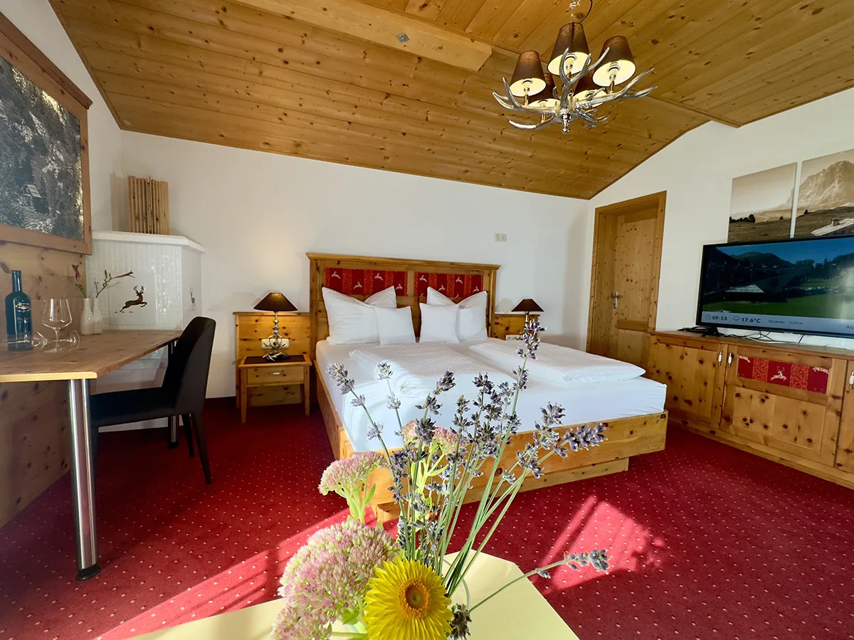 The suite is furnished with a wooden floor and with light-colored solid wood furniture in Tyrolean style and has the following equipment: shower/WC, cable TV, room safe and hair dryer. In addition, the suite has a balcony with a panoramic view and free underground parking.